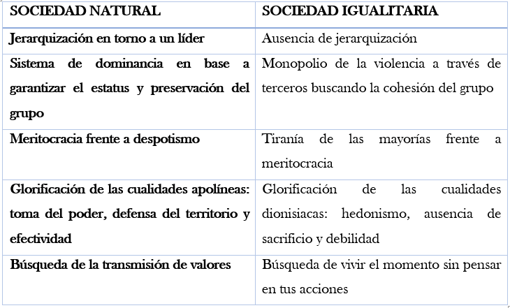 Con los anteriores datos en común y tras haber escuchado a la naturaleza su respuesta frente a las concepciones igualitarias, realizamos un pequeño esquema entre las diferentes sociedades y contemplemos cual sigue el camino destinado a la grandeza y cual persigue el convertirse en una rama muerta de la evolución.